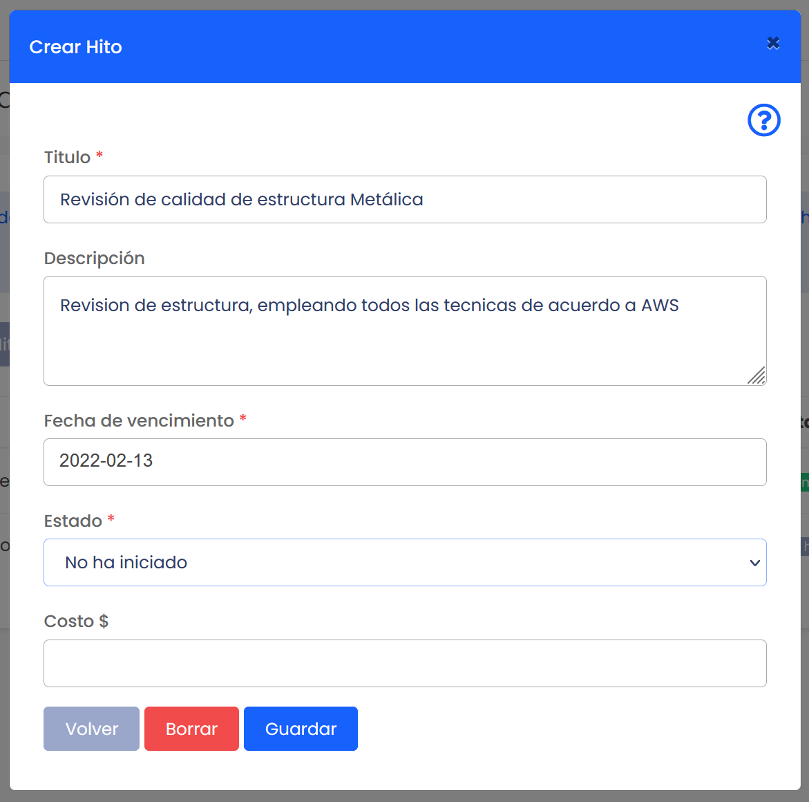 Si se selecciona el botón añadir, aparecerá una ventana emergente que permitirá crear un nuevo Hito, tal como se muestra en la siguiente imagen.