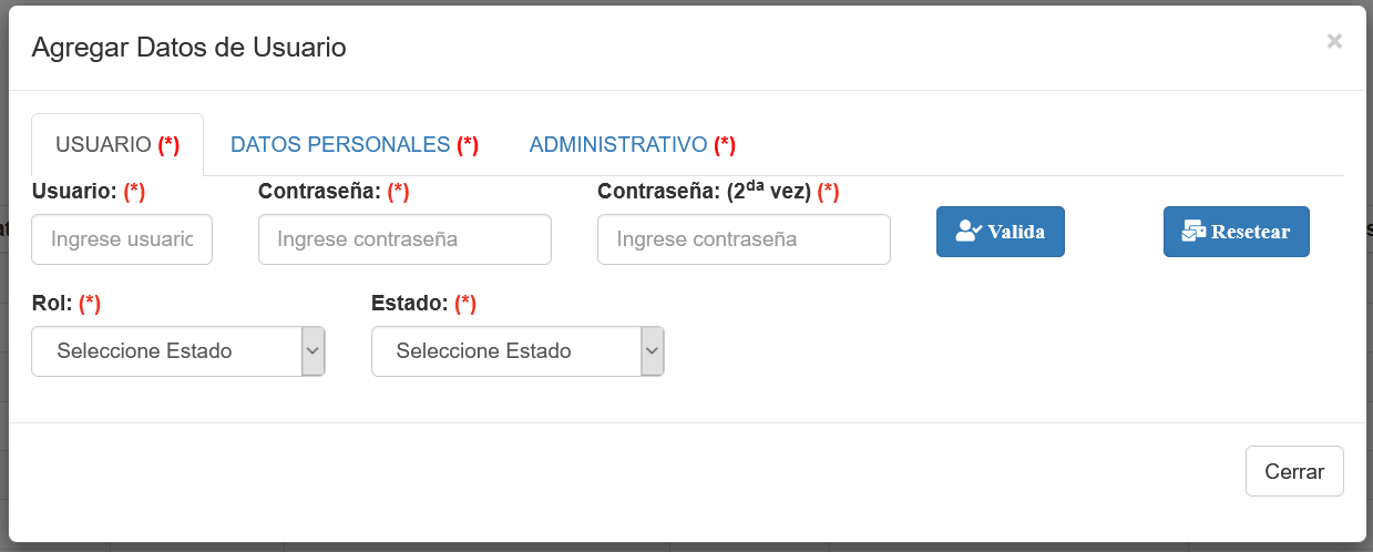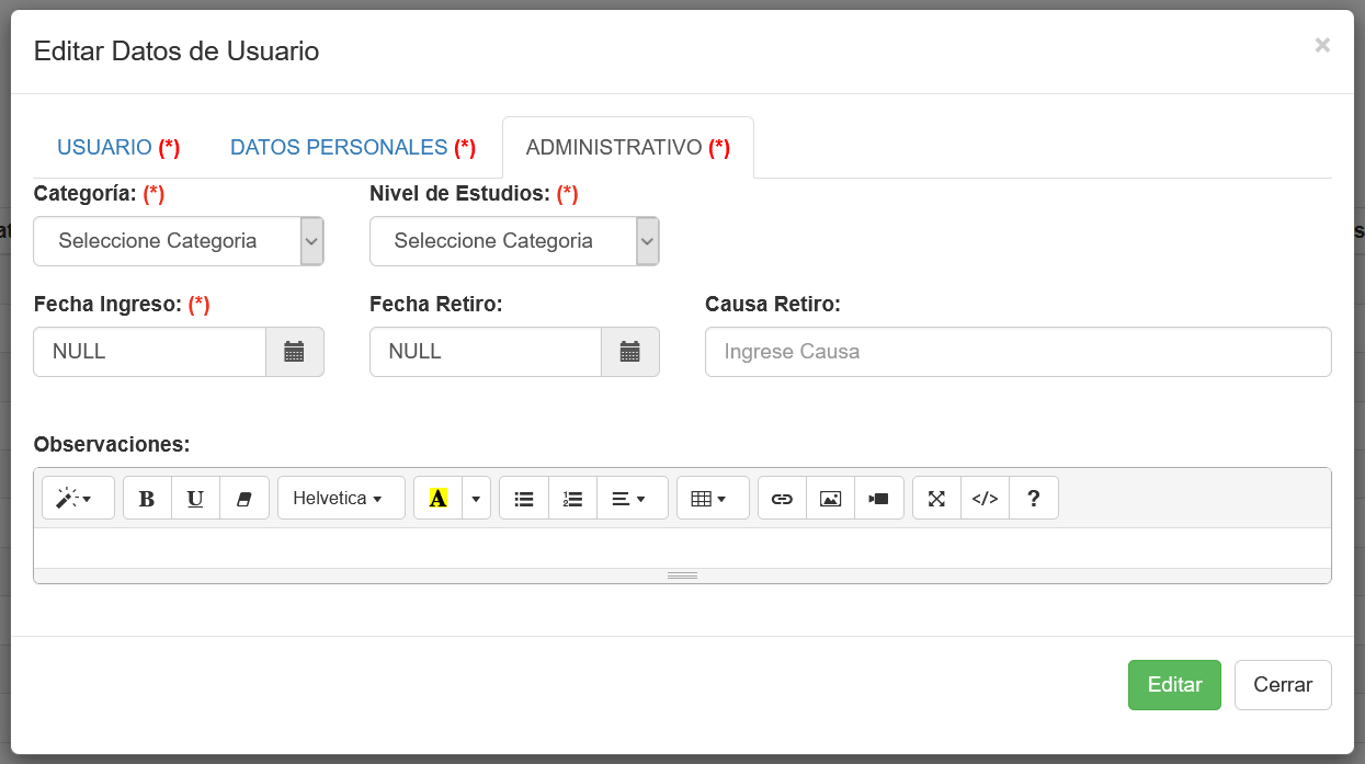 Una vez seleccionada el botón Editar o Agregar aparecerá una Ventana emergente que permitirá ingresar/modificar campos para un determinado usuario, tal como se muestra en la siguiente imagen.