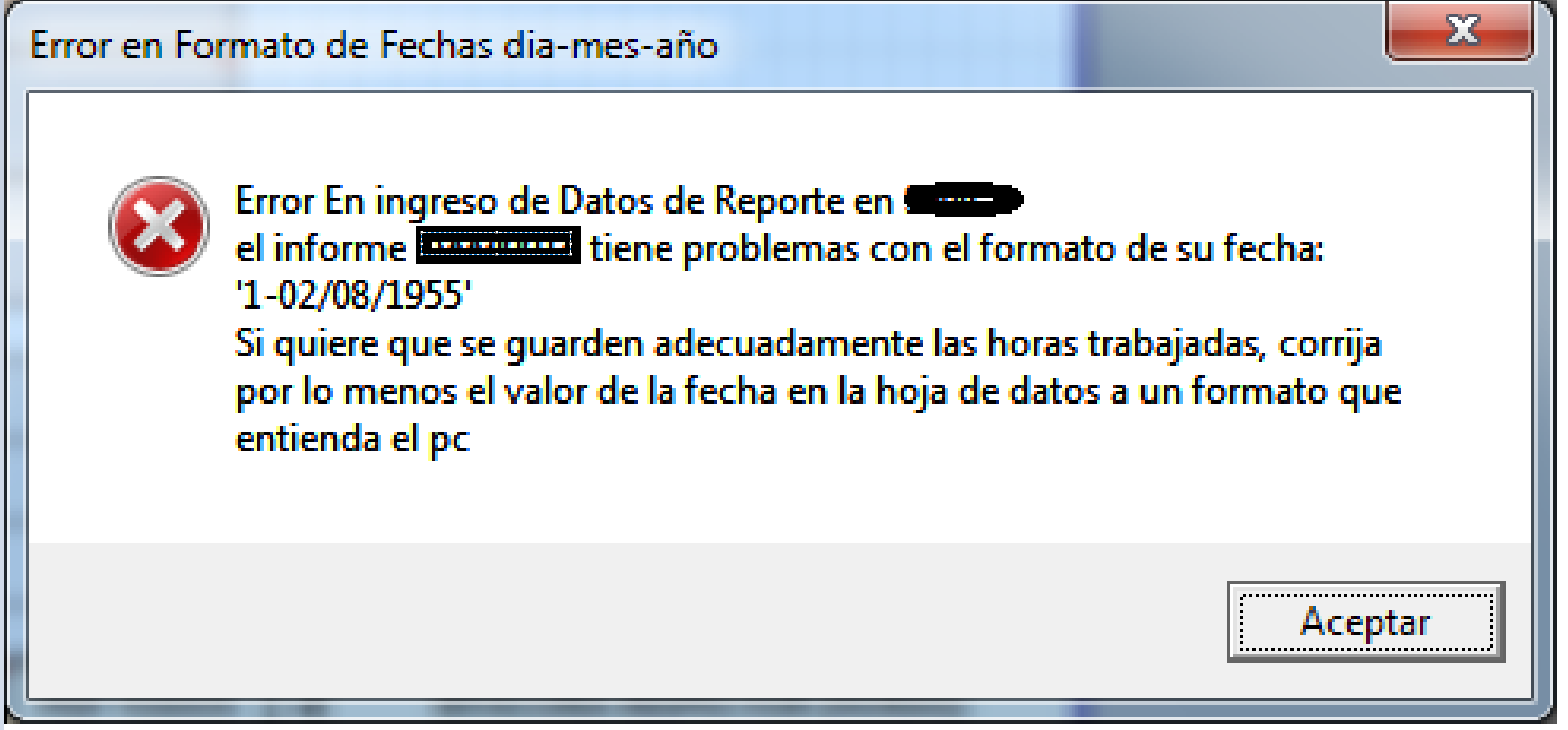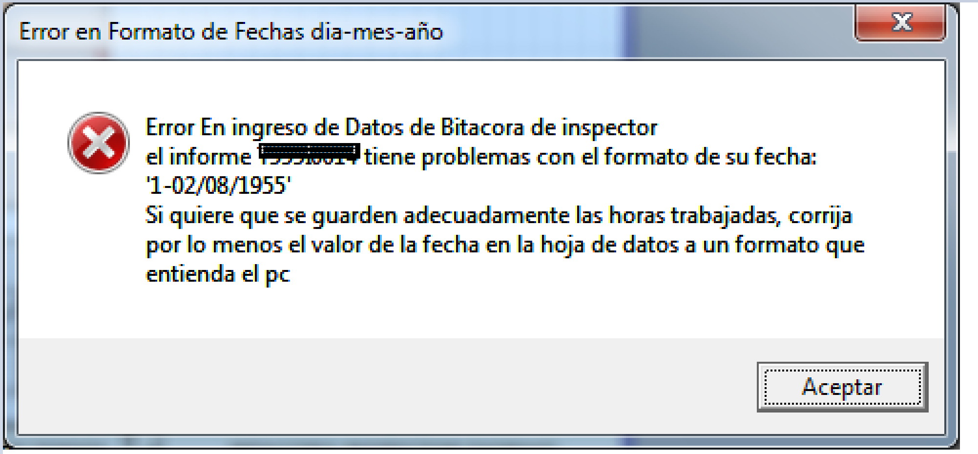 •Si el campo de fecha del respectivo informe contiene un valor de fecha, fuera del formato estándar, por ejemplo para denotar un informe en varios días, será necesario colocar una fecha valida en el campo de informe en la hoja de datos, por ejemplo el primer día que se trabajó, se debe cambiar el valor en la hoja de datos para poder inscribirlo adecuadamente en el sistema. Cada vez que se haga refrescar habrá que corregir este valor.