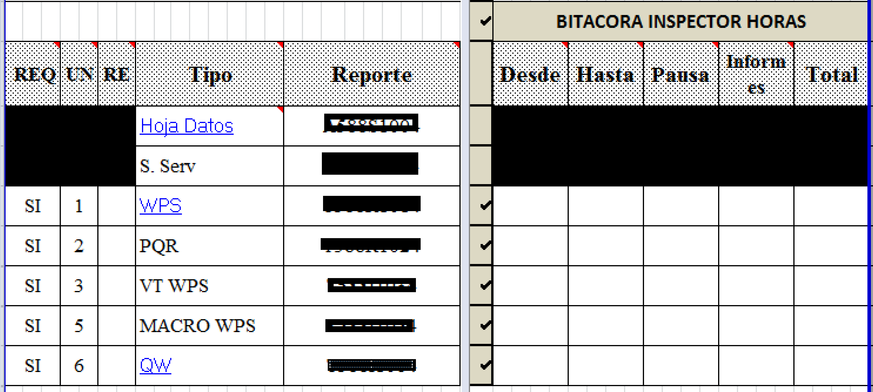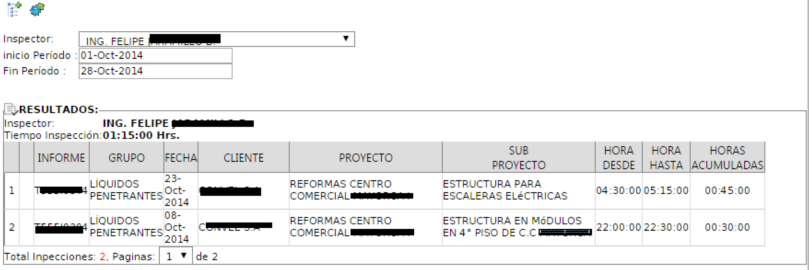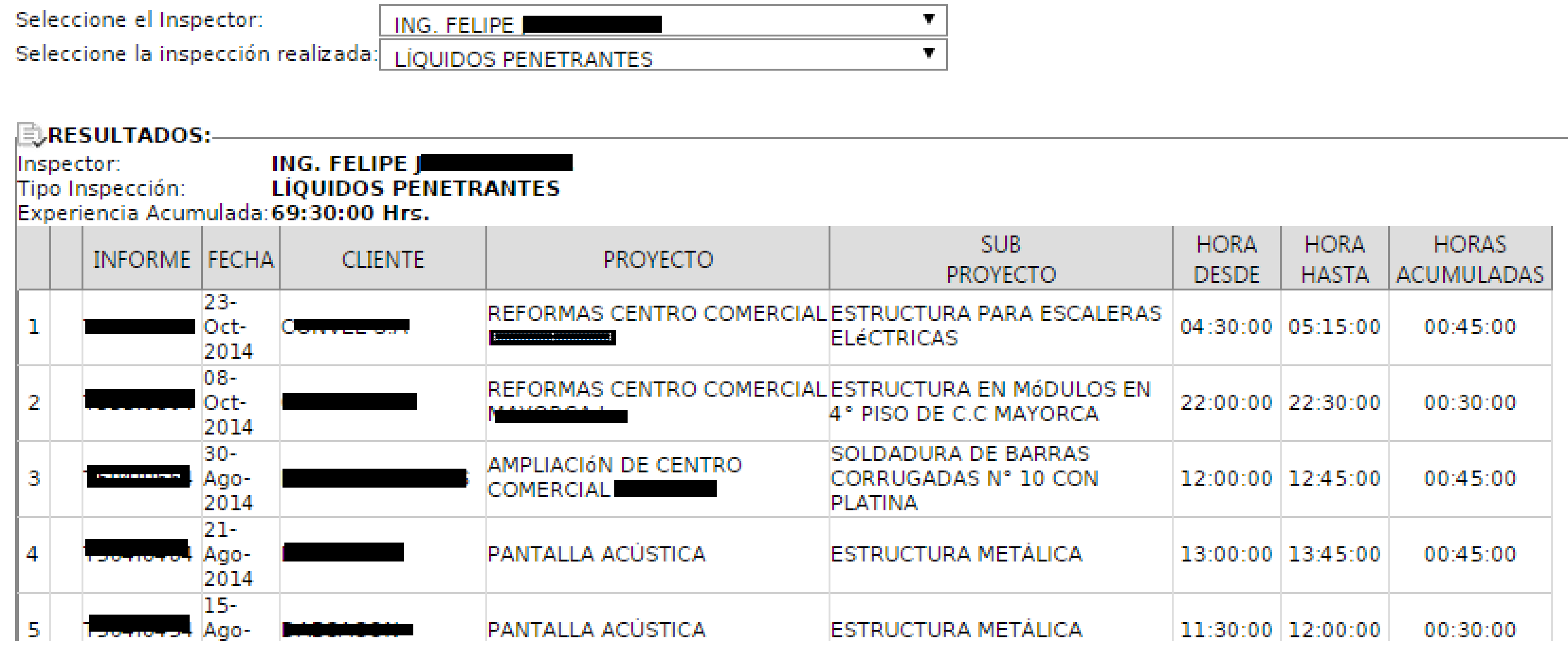 Cada informe que se emplee en la plantilla, permitirá rellenar unos campos con valores de tiempo que representan las horas invertidas por cada inspector en la realización de cada trabajo, esto es de particular interés en el sentido que se permite acreditar la experiencia de un inspector en una determinado tipo de inspección.