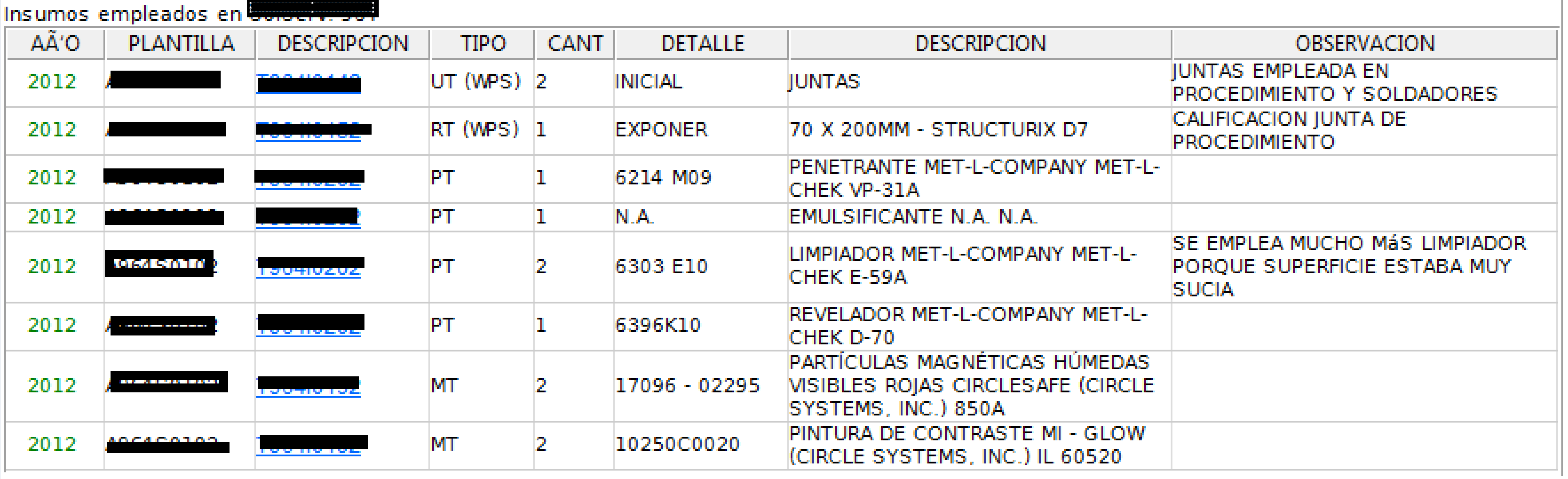 Fig 1036 Detalle de Actividades realizadas en inspección tipo Líquidos Penetrantes.