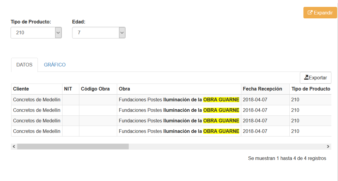 Fig 691 Listado de los registros de ensayos (probetas) de una determinada Orden de Servicio que posea un determinado tipo de producto y edad.