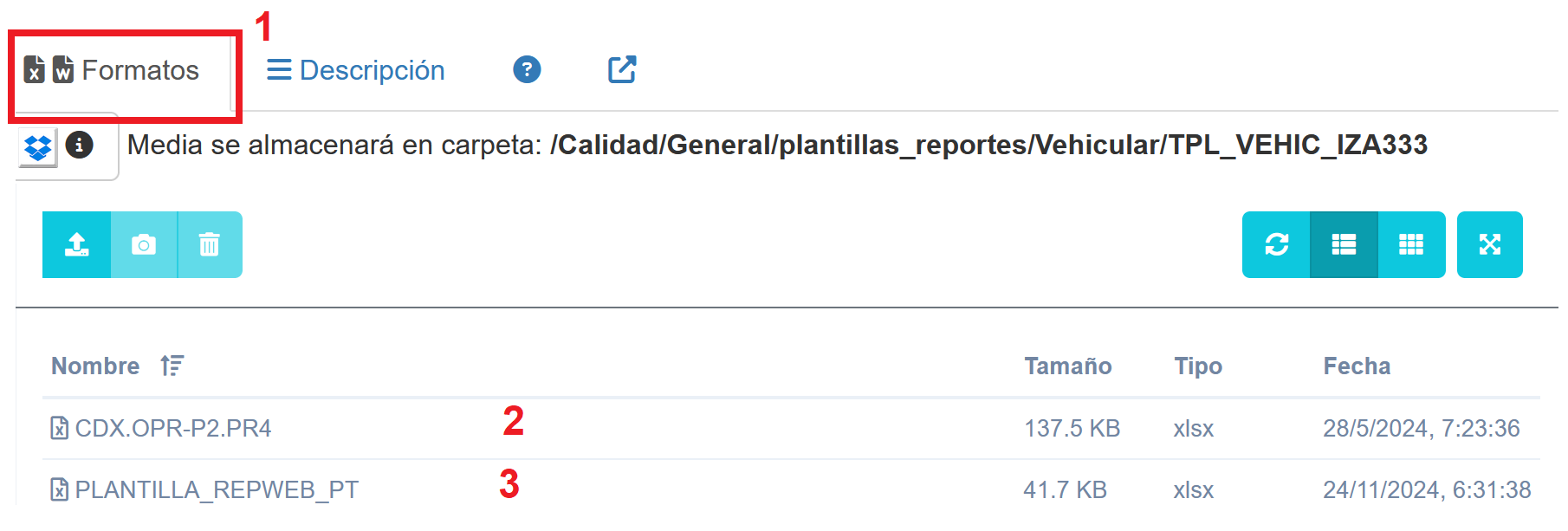 Cada vez que se carga un formato plantilla de reporte, se activa el módulo de carga de multimedia para formatos (1)(pestaña Formato) , en el agrega un nuevo registro en el listado de archivos (2)(3).
