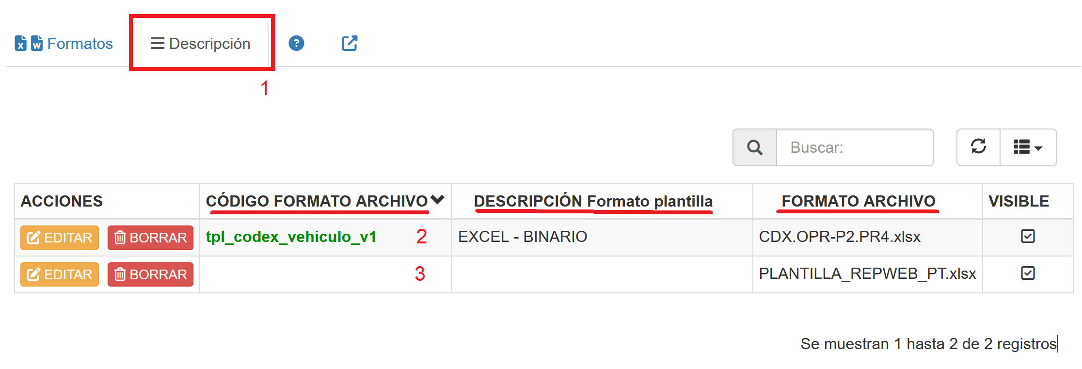 Inmediatamente luego de cargar el formato de plantilla es necesario seleccionar la pestaña Descripción (1), la cual registra y entrega la información detallada del formato cargado. Tal como se muestra en la siguiente imagen.