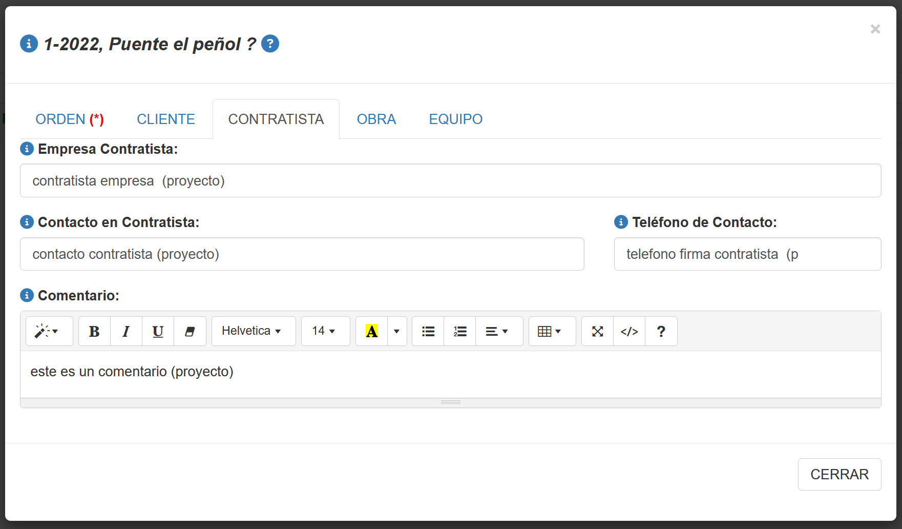 Fig 486 Ventana emergente para crear/editar una Orden/Proyecto de inspección, con pestaña CONTRATISTA activa..