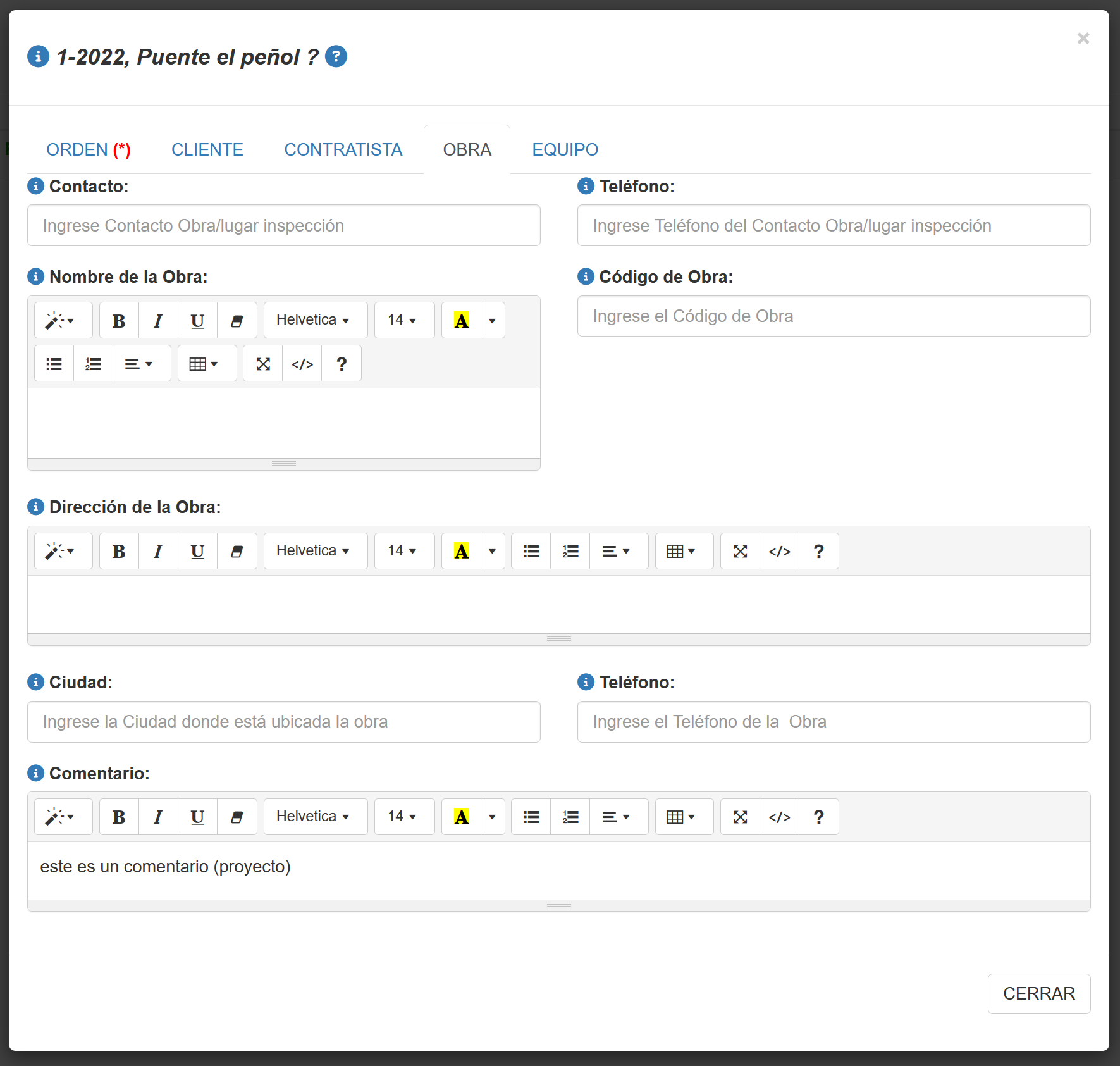 Fig 487 Ventana emergente para crear/editar una Orden/Proyecto de inspección, con pestaña OBRA activa..
