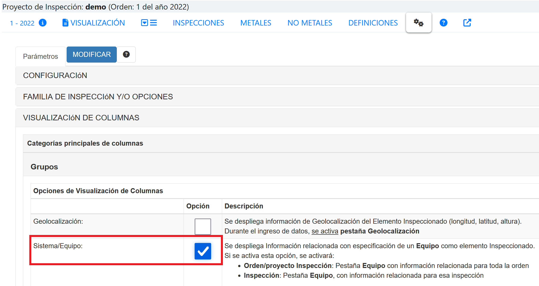 Poder especificar esto también se hace a nivel de Orden/Proyecto de Inspección.