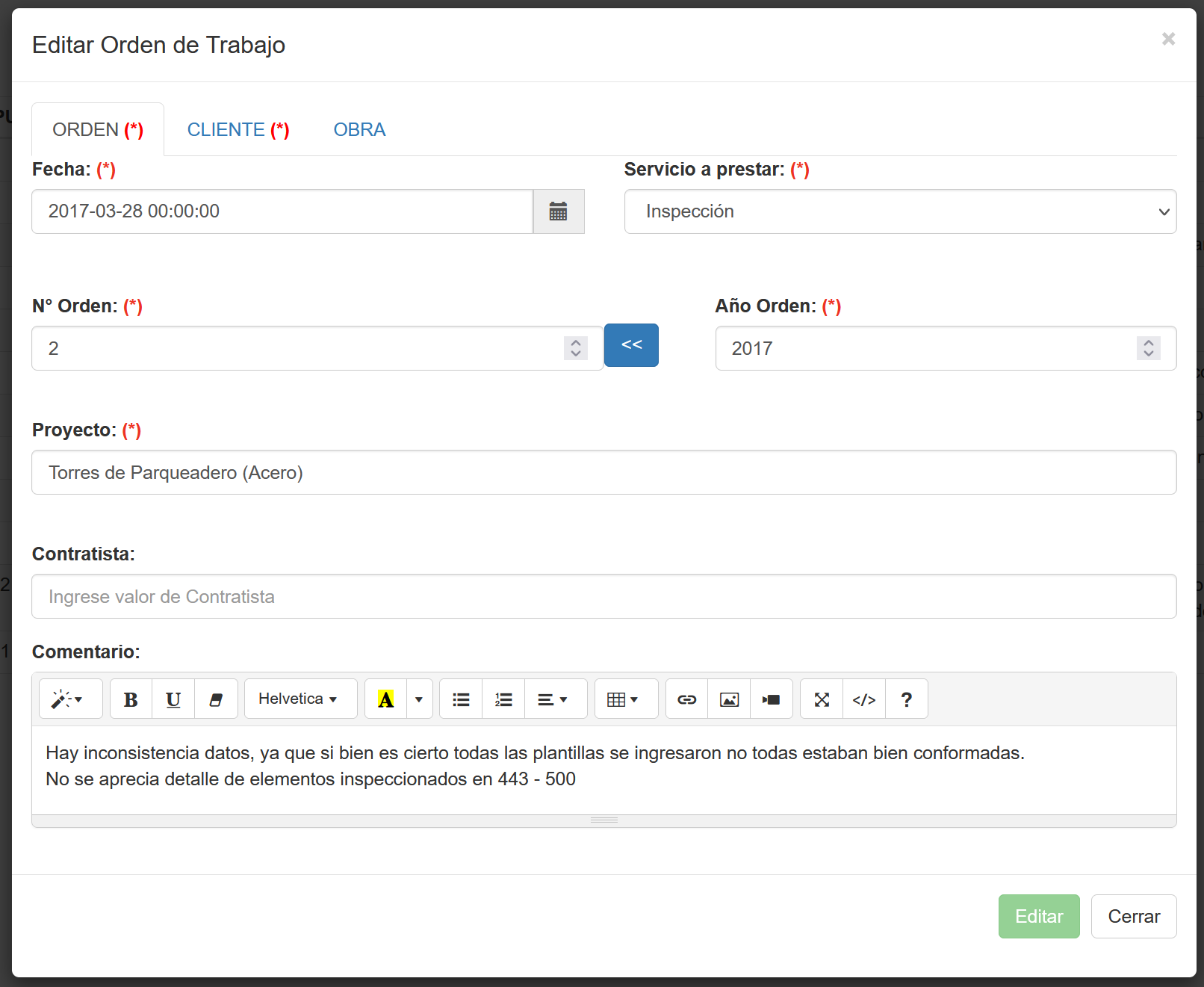 Editar Orden/Proyecto de Inspección