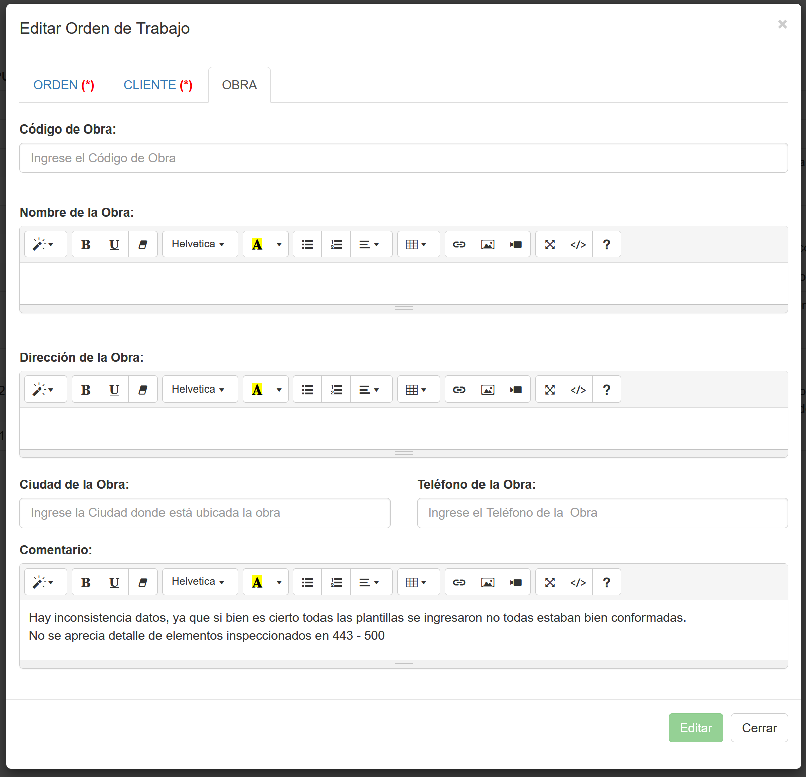 Si el usuario tiene permiso administrativo sobre esa orden el botón "EDITAR" estará activo y al presionarlo se presenta una ventana emergente con los parámetros de esta Orden de Trabajo.