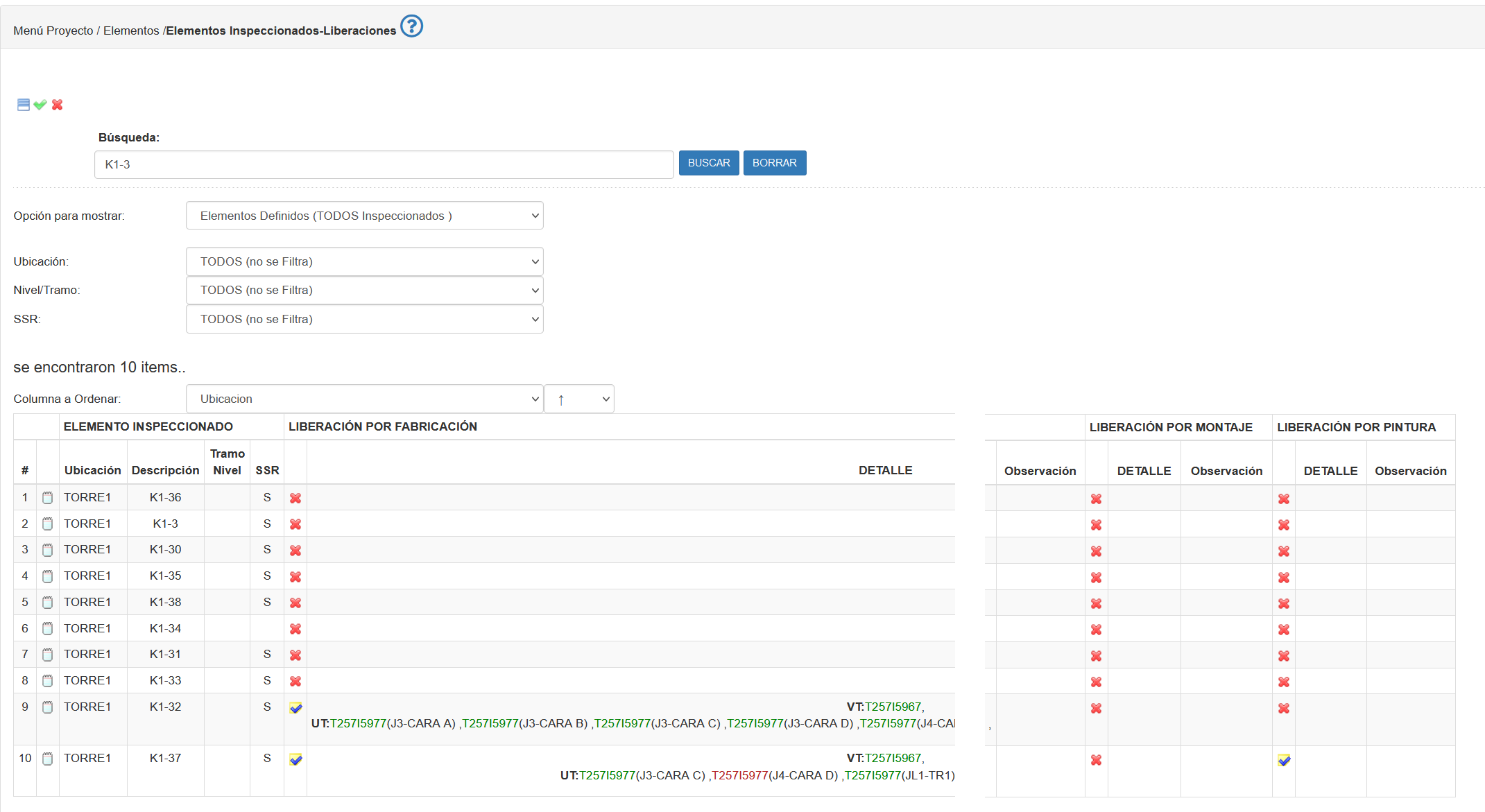 Cada elemento aquí listado, será posible editarlo en cuanto su liberación (tipo de liberación, observaciones, etc y se logrará un cuadro general tal como lo muestra la siguiente imagen