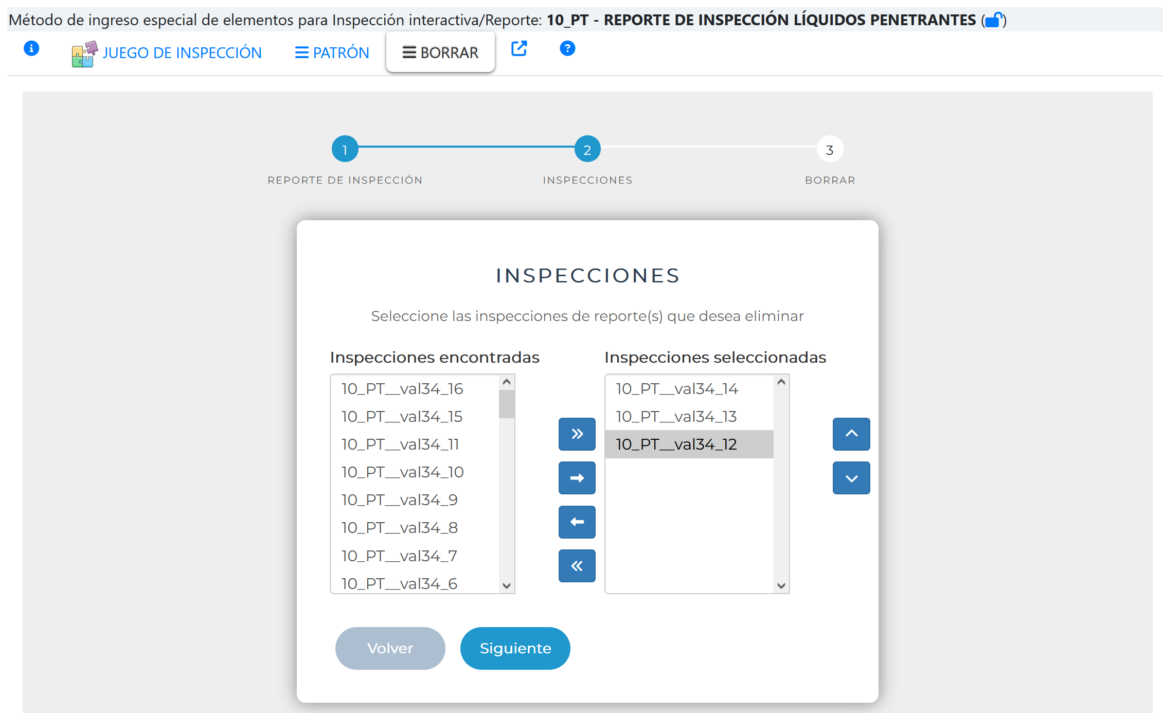 Al seleccionar la pestaña BORRAR se activa el asistente que permite el Ingreso de inspecciones empleando un patrón , tal como se muestra en la siguiente imagen.