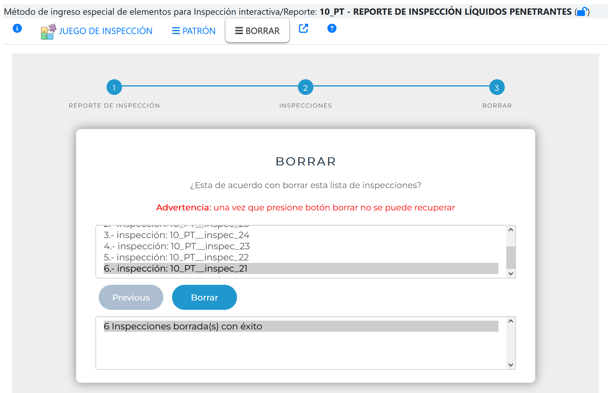 3.Confirmación para borrar inspecciones.