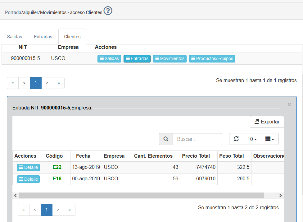 Esta opción se presenta al seleccionar el botón "ENTRADA" de la opción de menú del Cliente actual, se presenta una tabla de datos que contiene las órdenes de entrada del Alquiler y sus respectivas opciones, tal como se muestra en la imagen a continuación.