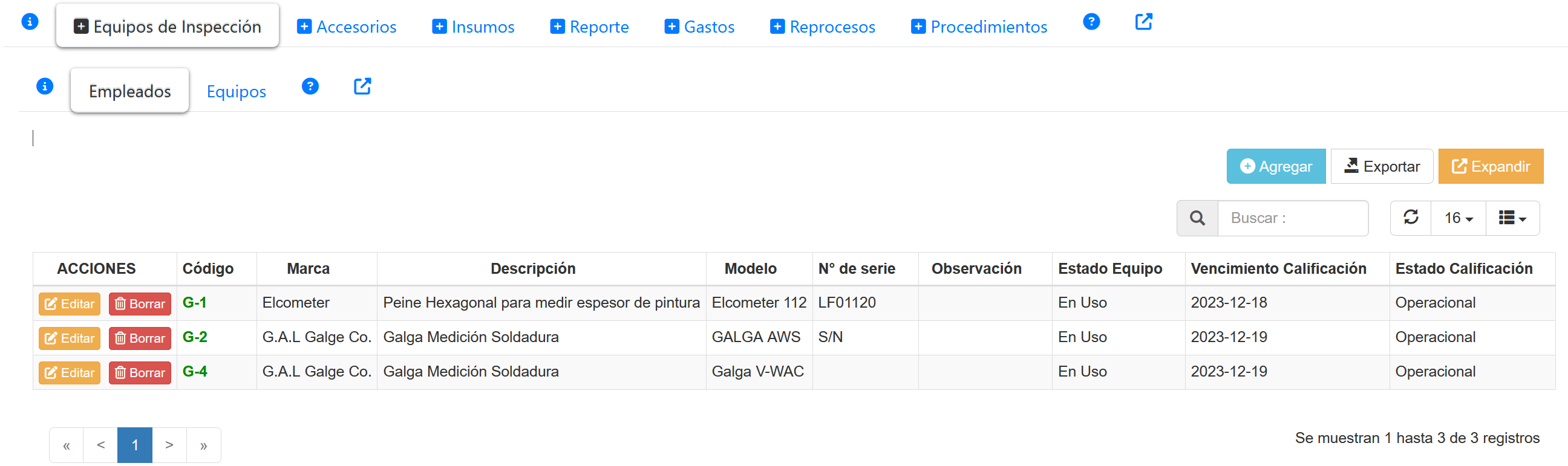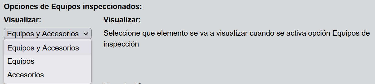 Se mostrarán tanto equipos como accesorios de los equipos de inspección, esta opción está seleccionada por defecto. Al seleccionar esta opción se mostrará una tabla como la siguiente