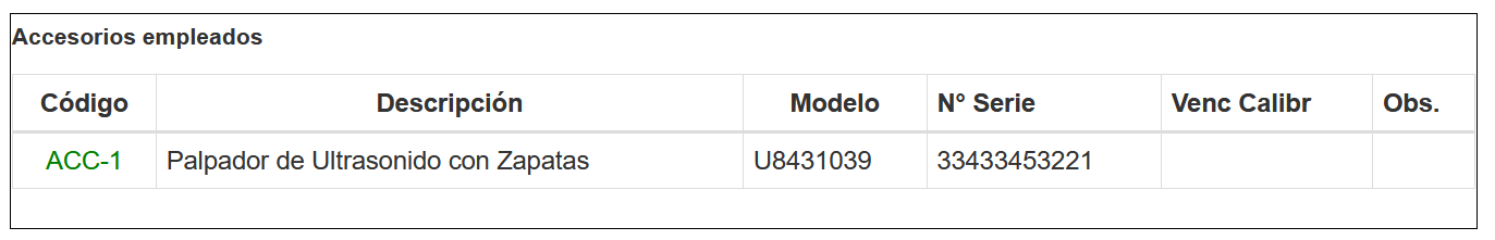 Se mostrarán solamente accesorios de los equipos de inspección, aunque en el reporte también estén definidos Equipos. Al seleccionar esta opción se mostrará una tabla como la siguiente