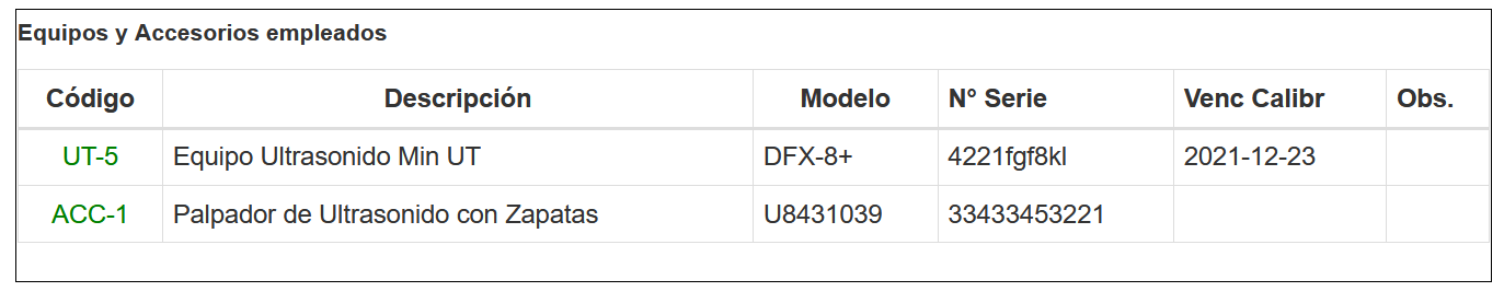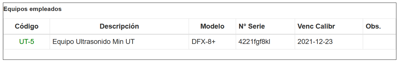 Los equipos que se agregan al reporte de inspección (los equipos que se emplearon para la inspección) agregados se mostrarán en una tabla, tal como se muestra en la imagen continuación.