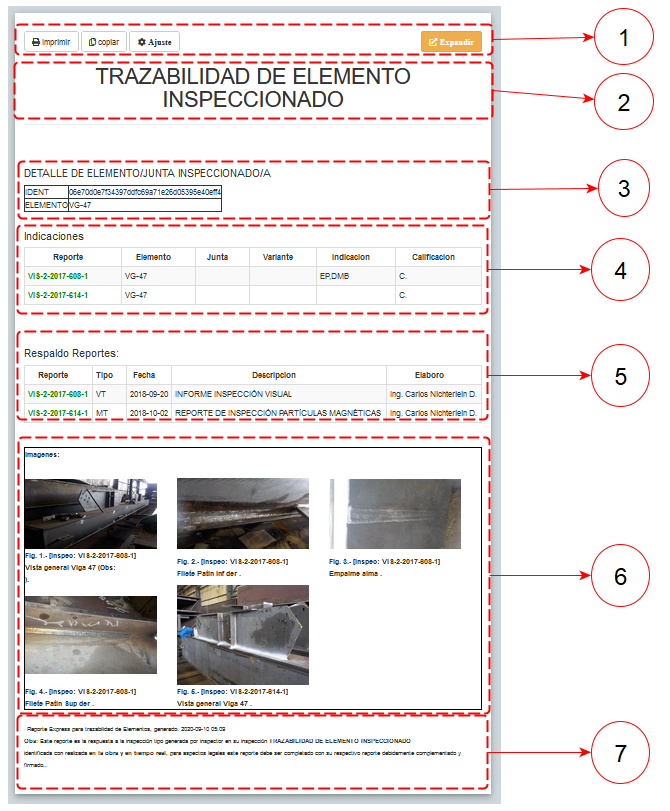 Fig 953 Estructura típica de un reporte de Trazabilidad de Elemento inspeccionado.