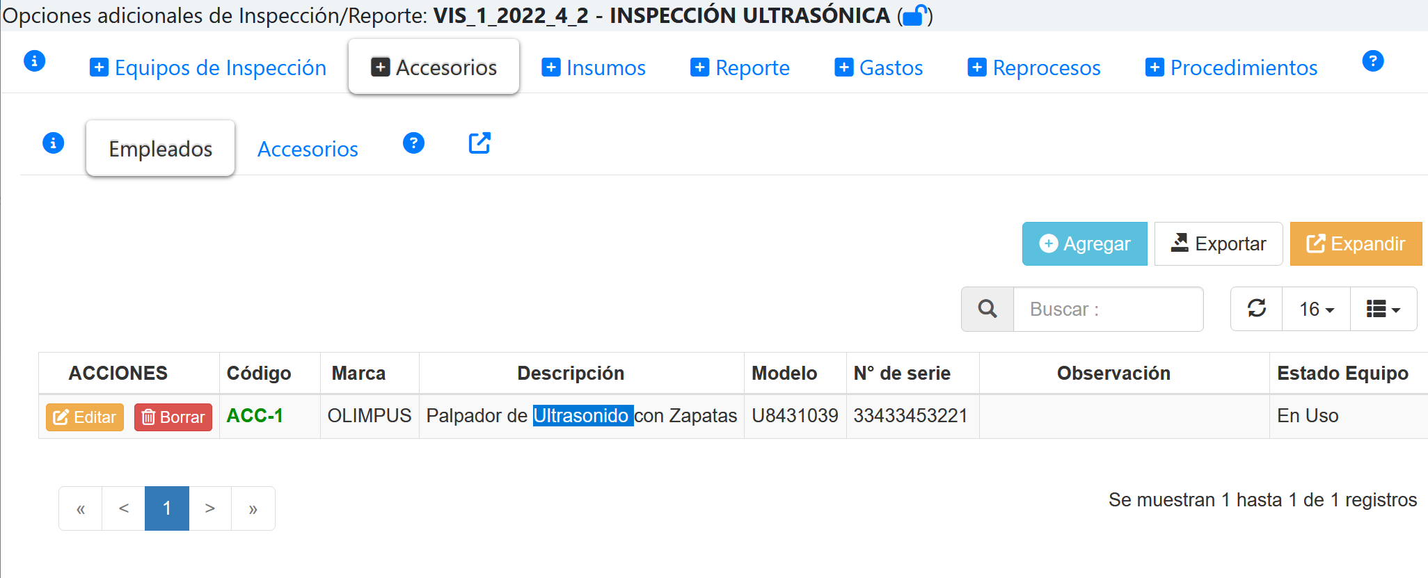Al seleccionar la opción Accesorios (de Equipos de Inspección) se activará un segundo nivel de pestañas y el detalle de los equipos asociados se muestra en la siguiente imagen.