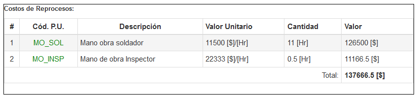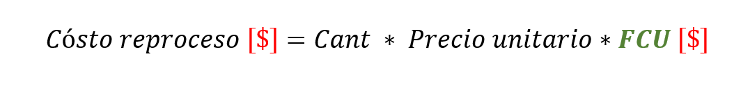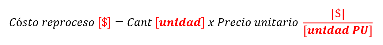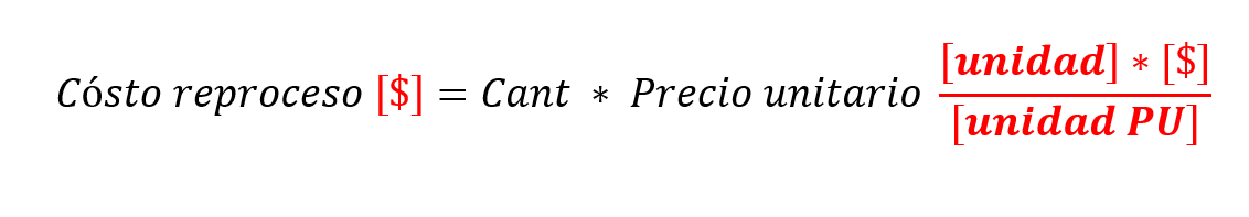 En este caso el cálculo del costo de reproceso no se limita a multiplicar el precio unitario x la cantidad sino que debe considerarse unidades (normalmente se encierran en paréntesis cuadrado [$]), esto se visualiza mejor a través de la siguiente imagen (se ha resaltado en rojo las unidades para mejor comprensión)