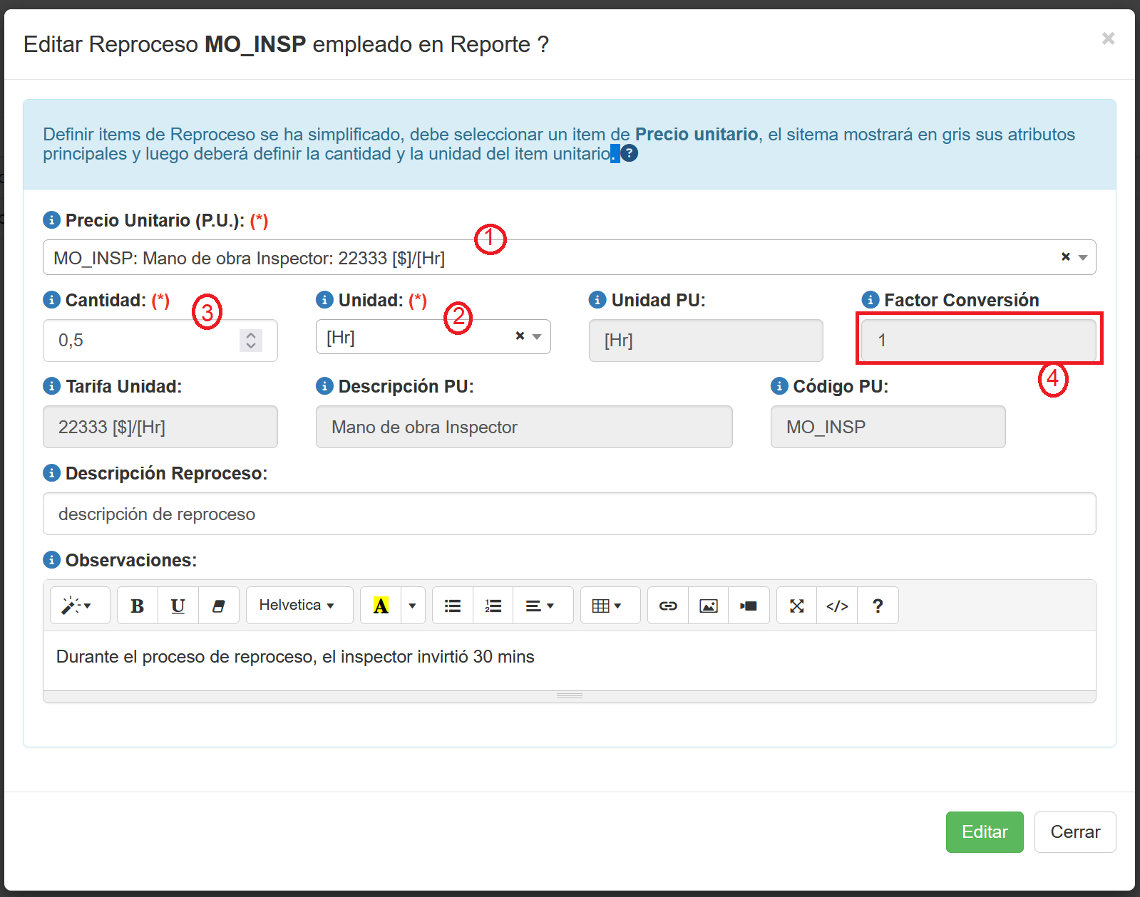 Permite asociar un costo de reproceso al reporte de inspección, empleando para ello una tabla de precios unitarios P.U. previamente definida en el sistema y estableciendo una cantidad. El producto de ambas determina un costo y este se asocia al reporte de inspección. |