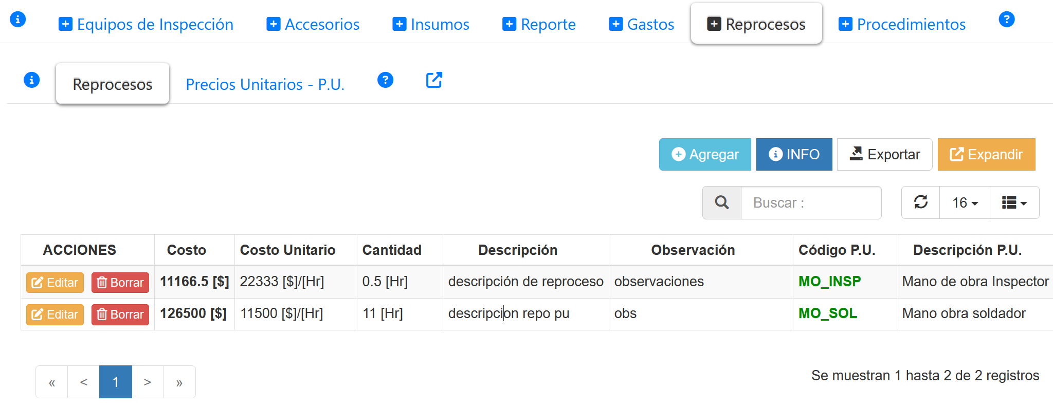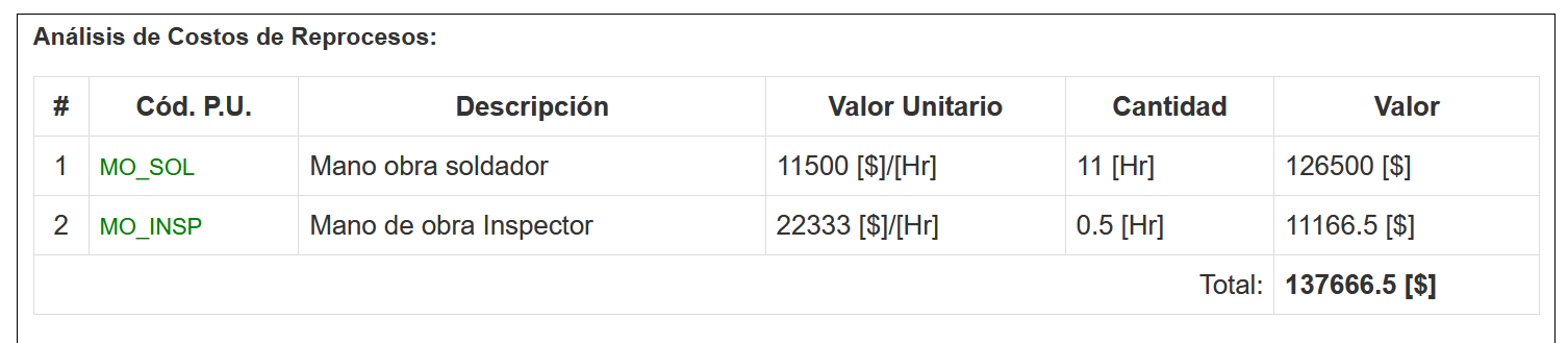 Fig 1248 Listado de Costos de Reproceso asociados al Reporte de inspección.