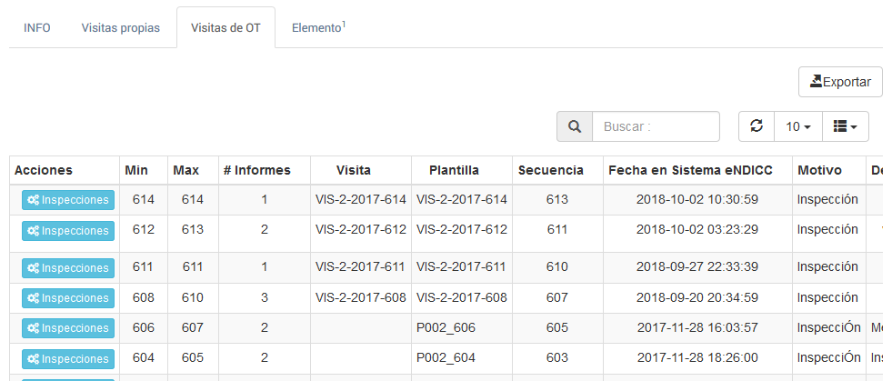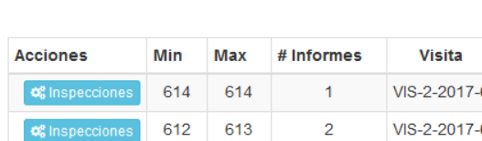 Inspecciones Inspecciones, cambia la vista actual (al tercer nivel de PESTAÑAS) para permitir la visualización de las inspecciones realizadas