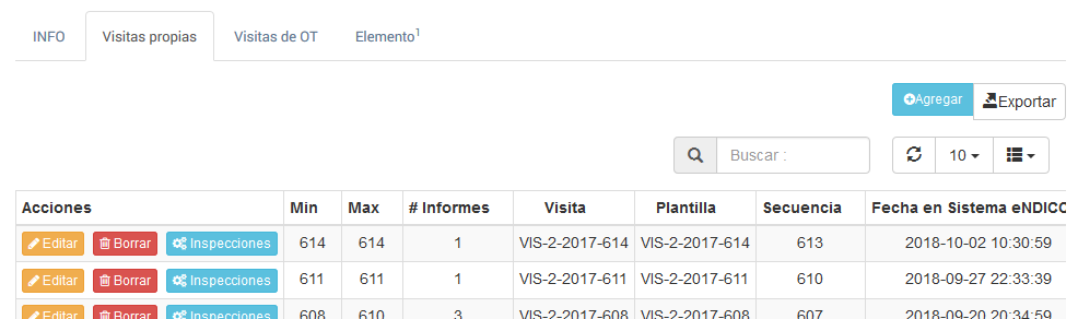 El botón Inspecciones, presente en cada ítem de la tabla de datos lo remite a uno a la inspección pertinente, esto se representa con un tercer nivel de PESTAÑAS, continua con la PESTAÑA INSPECCIONES PROPIAS