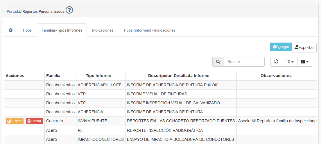 Reportes Personalizados /Tipos (de Reportes) - Familias (de inspección)