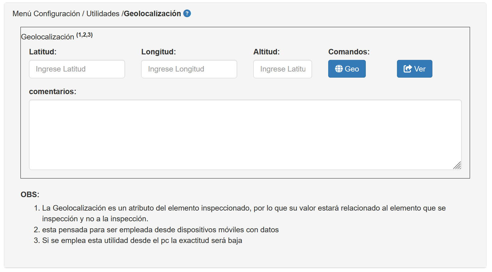 Para obtener latitud y longitud, es necesario presionar el botón GEO, el cual llenará los campos de Latitud, longitud altura y comentarios.
