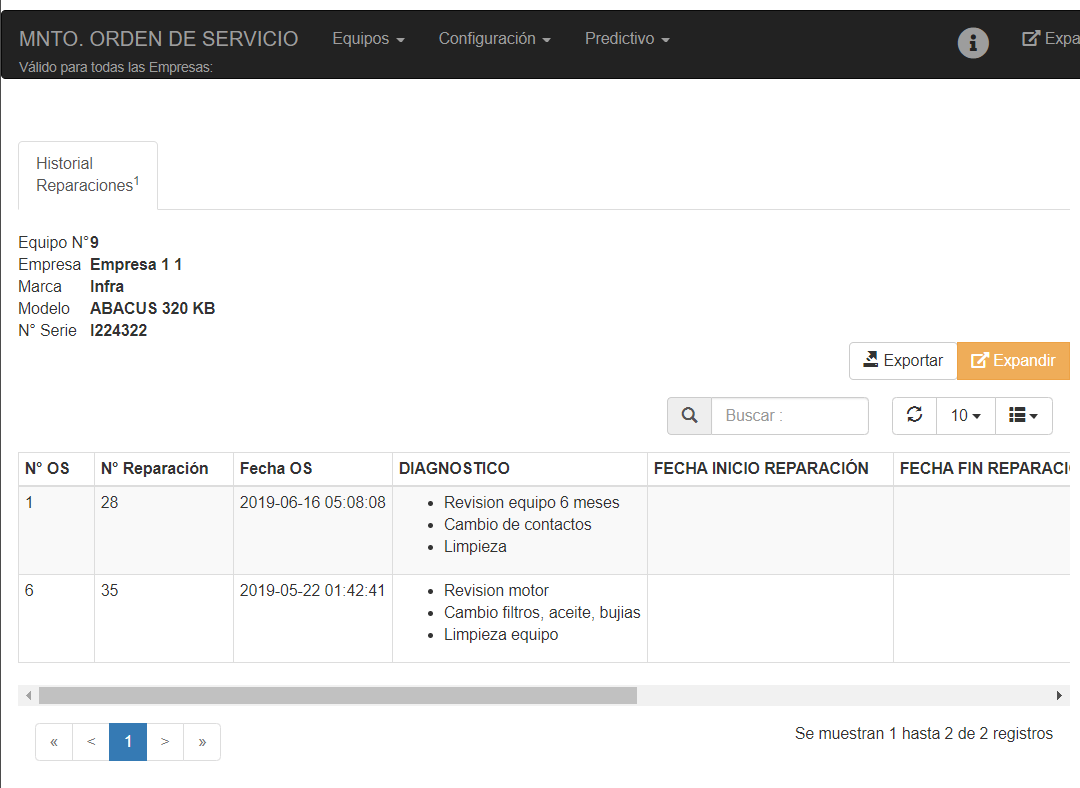 En esta pantalla en la parte superior derecha se hace una breve referencia al equipo y luego se muestra el listado de reparaciones realizadas