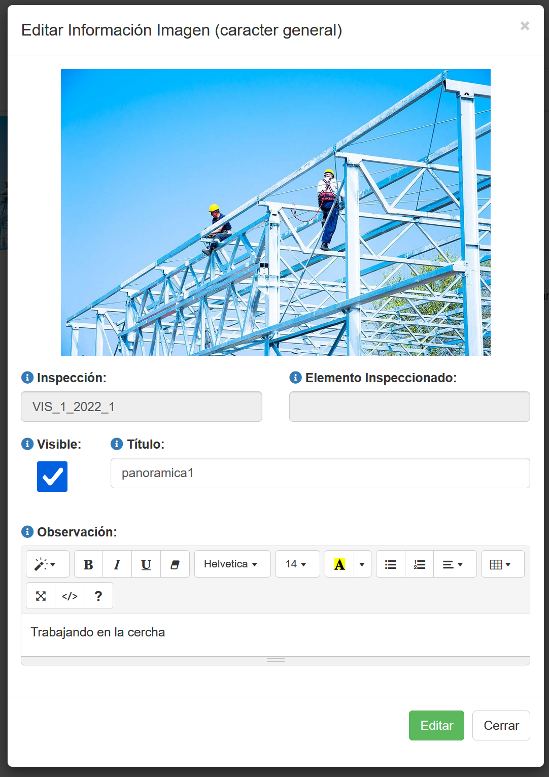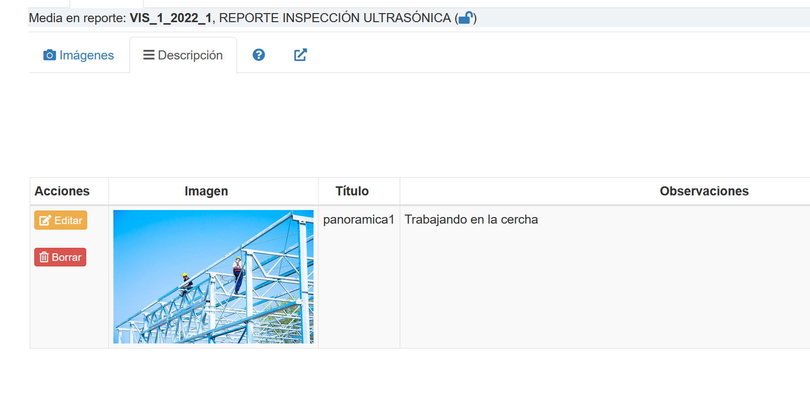 Este tipo de imágenes pertenecen a un reporte (son las que se tomaron en el desarrollo de éste), no están relacionadas a un elemento inspeccionado en particular. Pueden asociarse múltiples imágenes por elemento, el sistema no tiene límite al respecto, salvo la capacidad de almacenamiento que se emplee.
