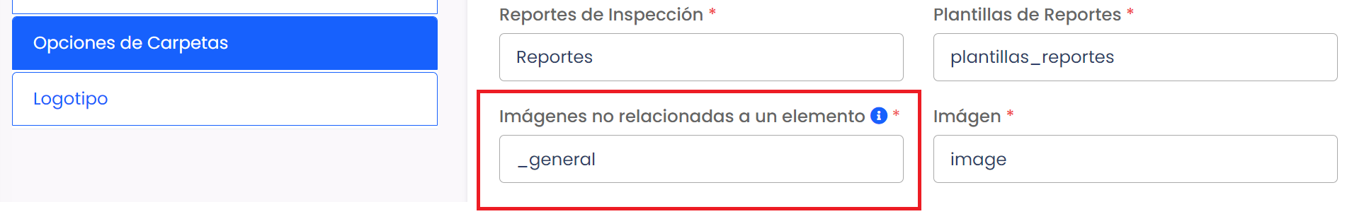 Estas imágenes se almacenan dentro de la carpeta del reporte, generalmente en una carpeta denominada _general, opción por defecto cuando se crea la cuenta de empresa. Más detalles, ver Opciones de Carpetas en configuración de empresa. Item Imágenes no relacionadas a un elemento, tal como se muestra en la imagen a continuación.