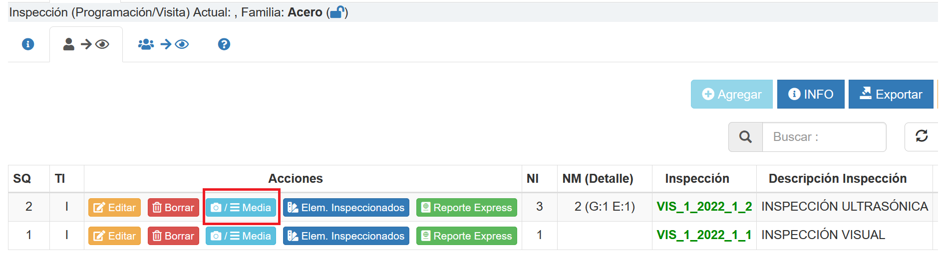 Para agregar una imagen de carácter general es necesario ir al listado de Inspecciones/Reportes y seleccionar el botón Media, el cual se encuentra disponible para cada reporte, tal como se muestra en el recuadro rojo en la imagen a continuación.