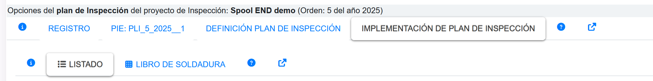 Fig 899 extracto de pantalla mostrando detalle de pestaña de 2do nivel luego de seleccionar pestaña IMPLEMENTACION DE PLAN DE INSPECCIÓN.