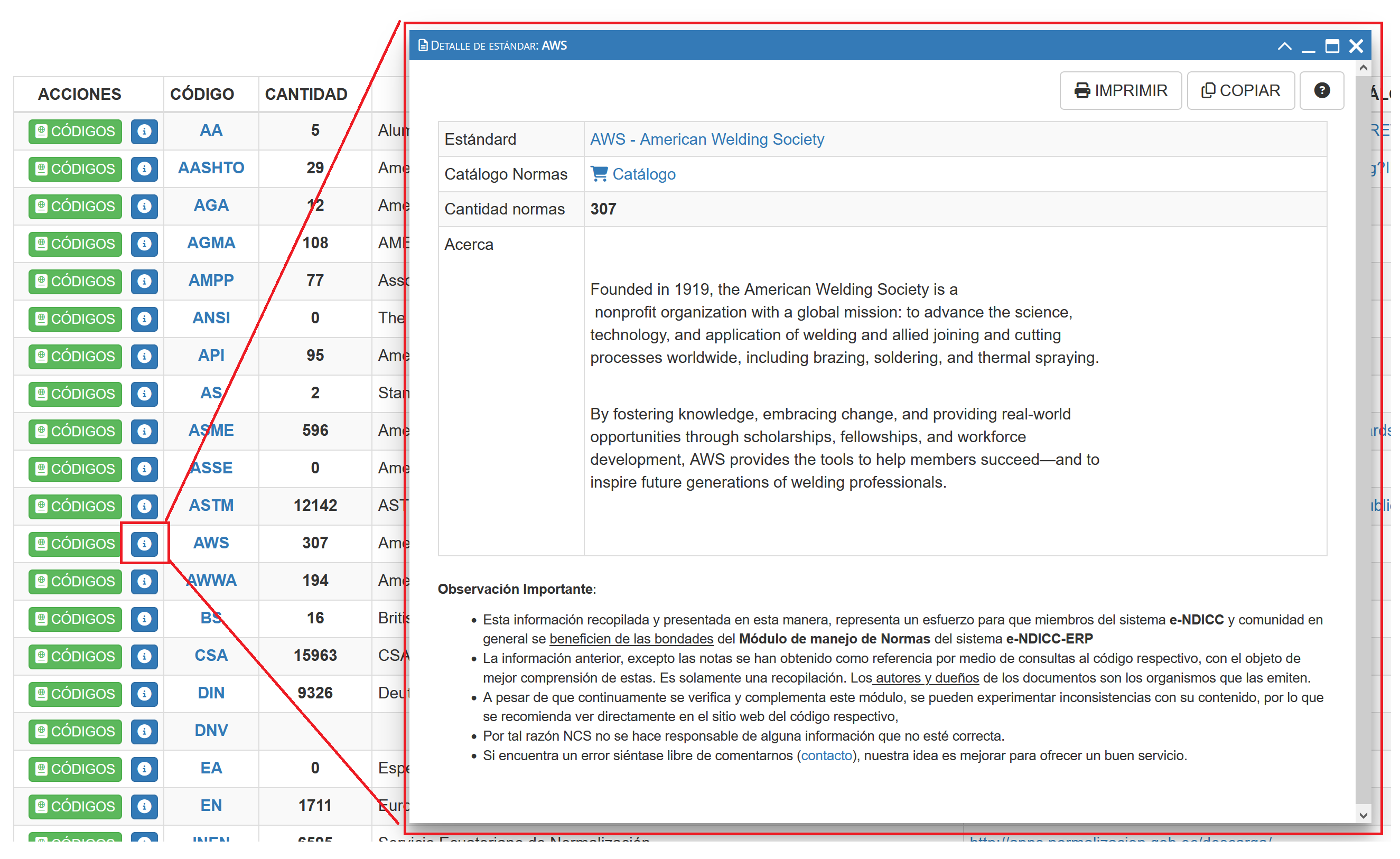 Al seleccionar el botón INFO de una determinada Organización o estandard aparecerá una ventana emergente con un detalle del estándar seleccionado tal como se muestra en la siguiente imagen.