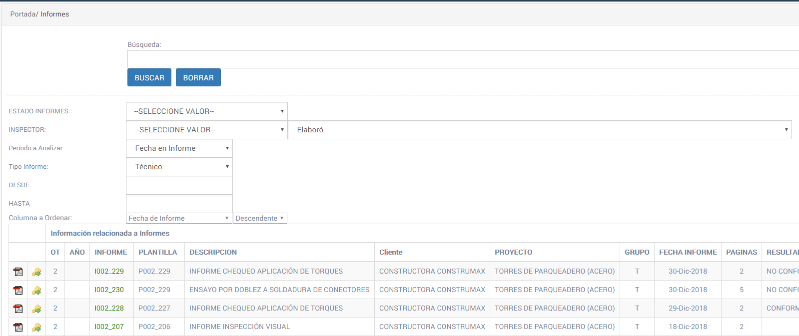 Esta opción muestra todos los reportes registrados en el sistema. Si se desea solamente todas los reportes registrados de una Orden de Trabajo determinada, ver opción listar todos los Informes de una OT