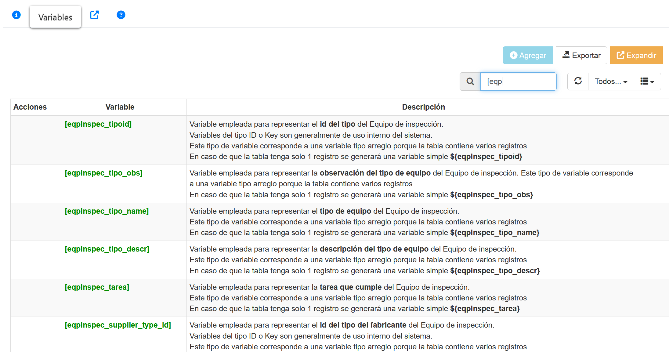 Filtra el contenido de la tabla de Variables de Plantillas de acuerdo al criterio ingresado en búsqueda. |