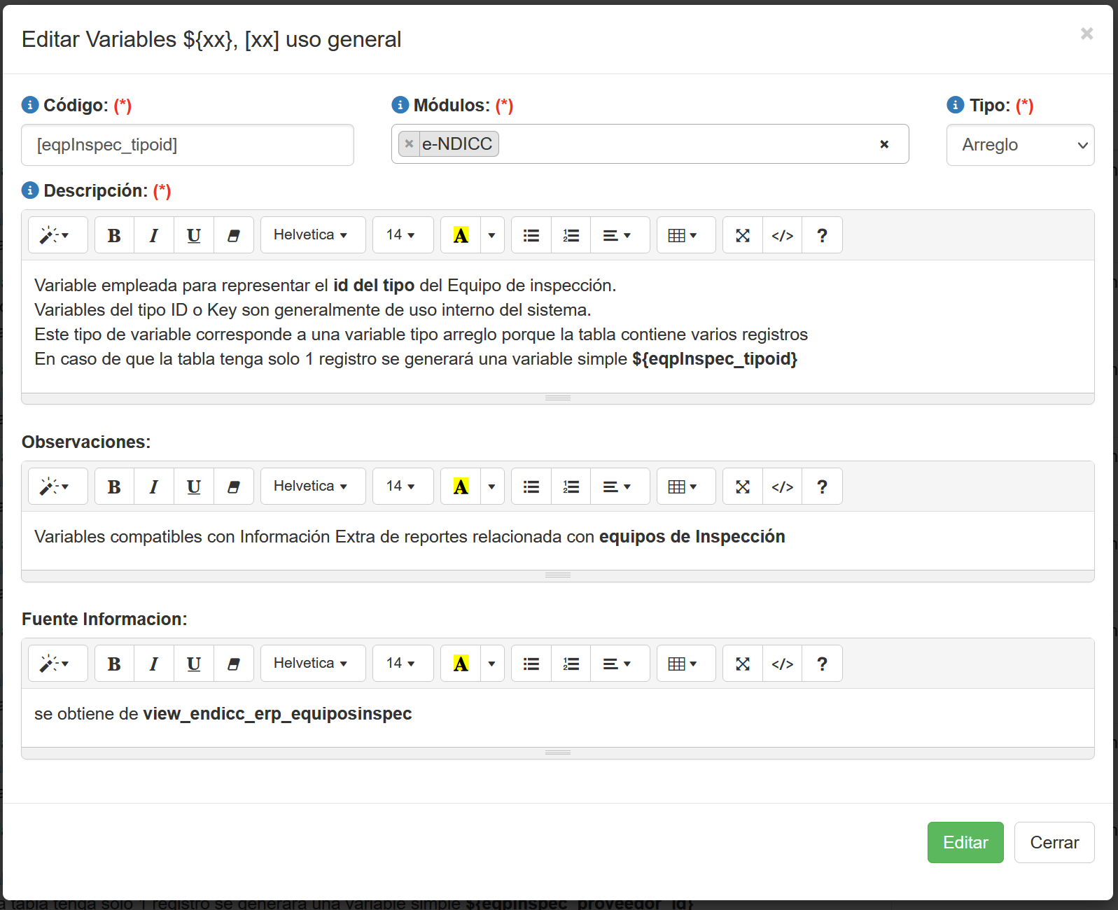 Permite visualizar y definir las variables de las plantillas para generar un reporte (en el sistema e-NDICC-ERP. |