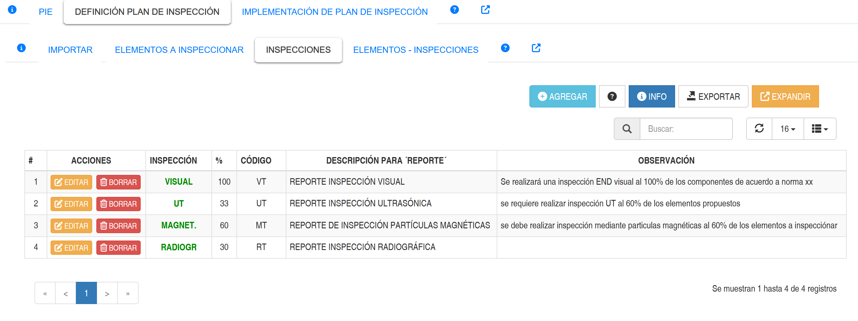 Fig 882 extracto de pantalla mostrando el listado de inspecciones que tendrá este plan de inspección