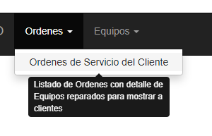 •Ordenes de Servicio del Cliente Muestra todas las ordenes del cliente seleccionado. Esta es la opción que el cliente verá cuando acceda al sistema. Ver más detalles enOrden es de Servicio para el cliente