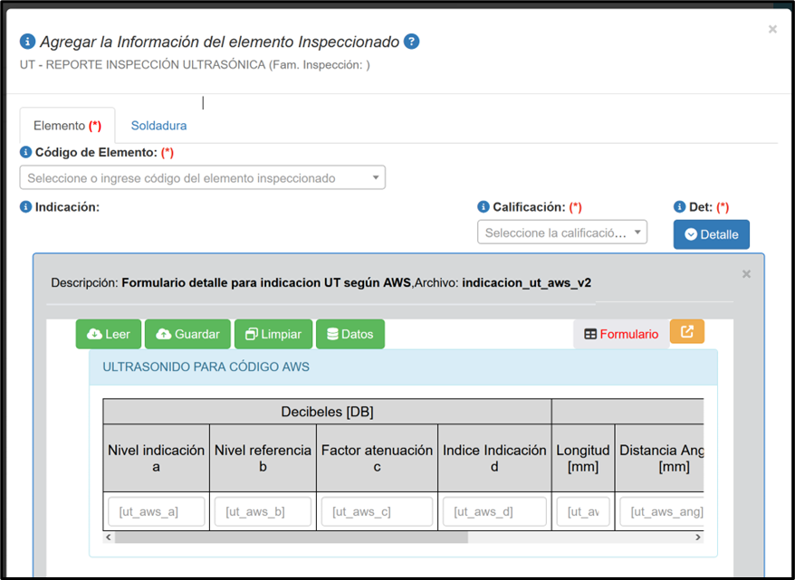 En el método indirecto no es posible emplear las indicaciones antes mencionadas sino que es necesario recurrir al uso de un sub formulario, el cual permitirá definir parámetros para poder describir las indicaciones del elemento inspeccionado, tal como se muestra en la imagen a continuación.