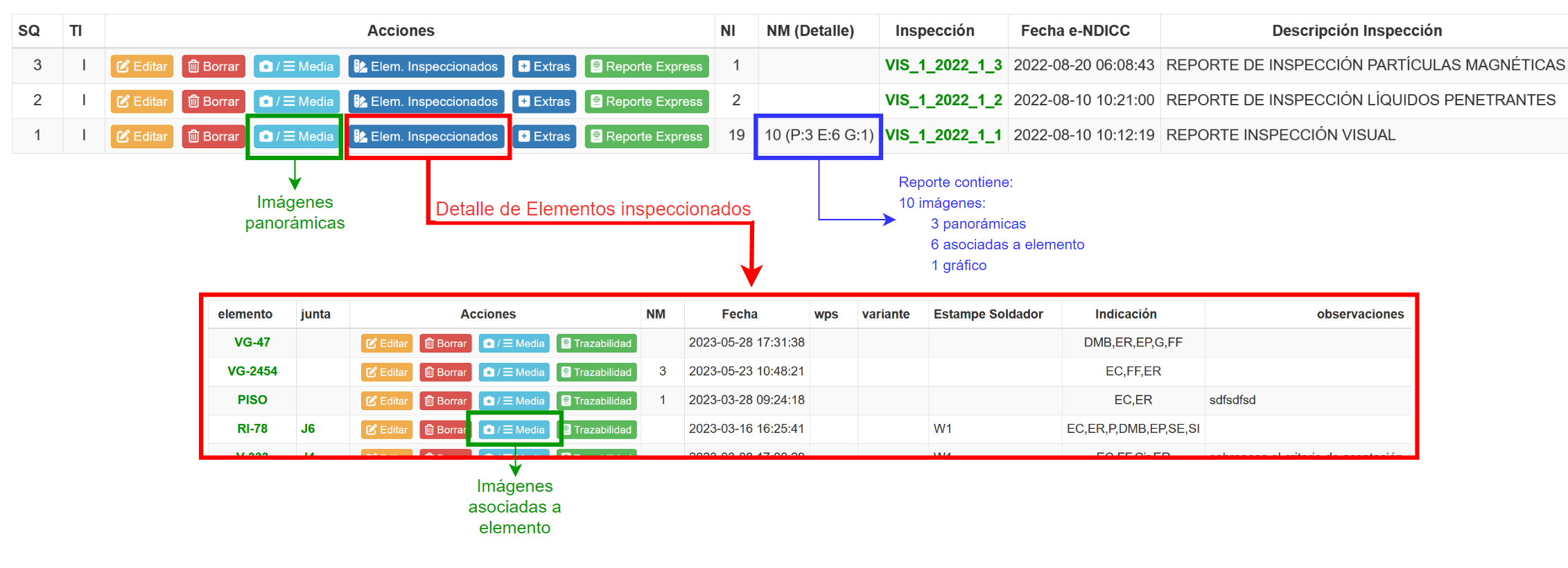 2.Asociadas al elemento inspeccionado. Es decir, junto con poder documentar la imagen se establece una relación entre el reporte y elemento inspeccionado, esta asociación es muy útil, especialmente cuando se desea realizar trazabilidad ya que no solo se establece las inspecciones que se realizan a un determinado elemento, sino que también puede incluir las respectivas imágenes.