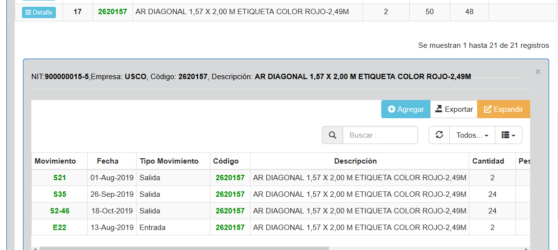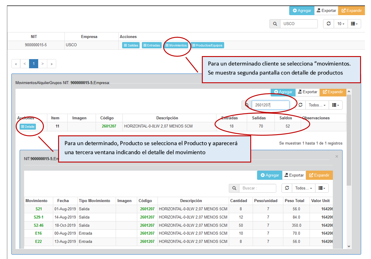 En la imagen anterior, luego de seleccionar un determinado cliente se presentará un listado de los elementos que este cliente tenga alquilados. Junto a cada elemento del listado hay 3 columnas que permiten visualizar la cantidad de elementos registrados en las entradas, salidas y saldos de éste equipo. Por cada equipo hay un botón Detalle que permite visualizar el detalle de los movimientos antes mencionados, Esto se aprecia en la siguiente imagen.