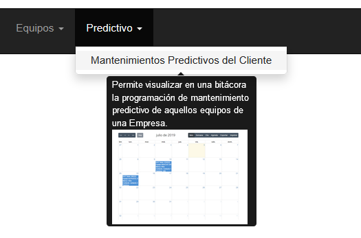 Esta opción permite visualizar en una bitácora la programación de mantenimiento predictivo de aquellos equipos de un determinado Cliente, tal como se muestra en la siguiente imagen.