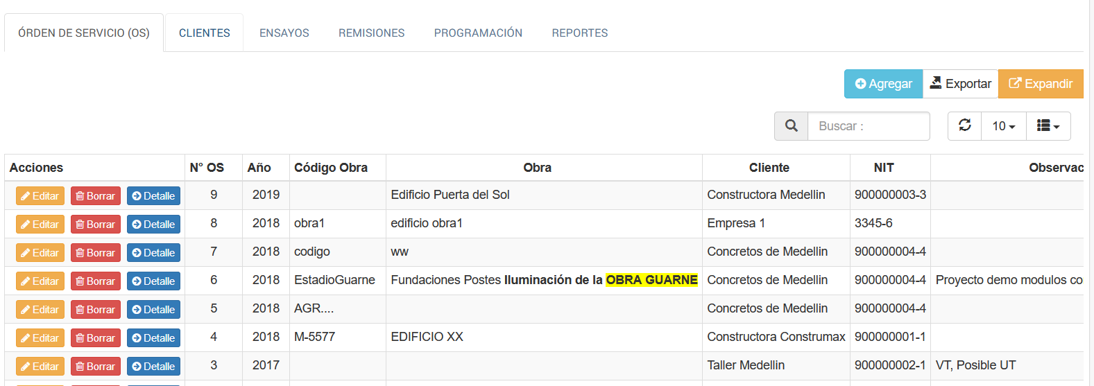 Una vez seleccionada la PESTAÑA OBRAS, aparece una tabla de datos, como se muestra en la siguiente figura.