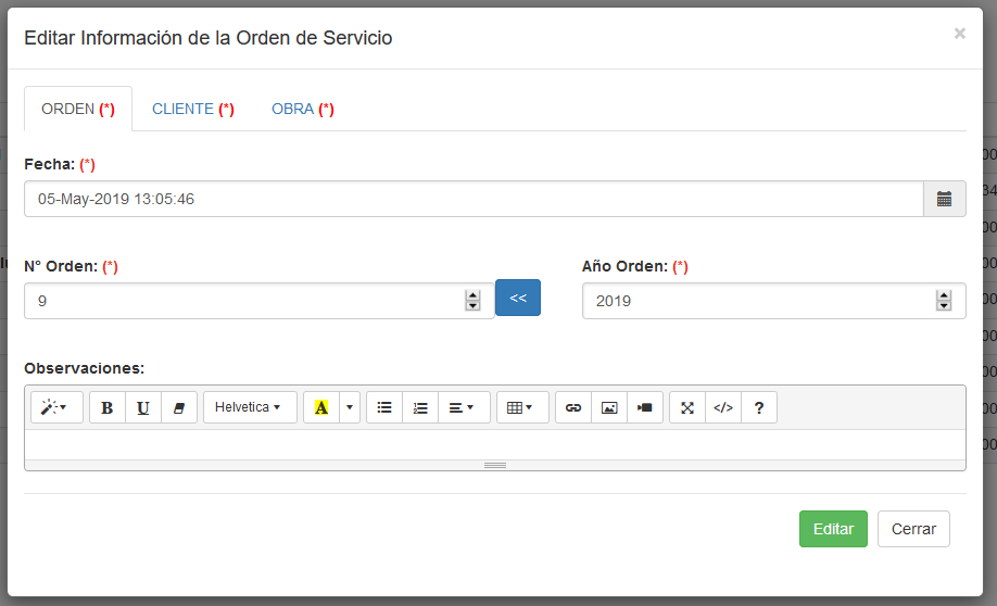 Fig 685 Ventana emergente para ingreso de nueva Orden de Servicio, pestaña ORDEN activa