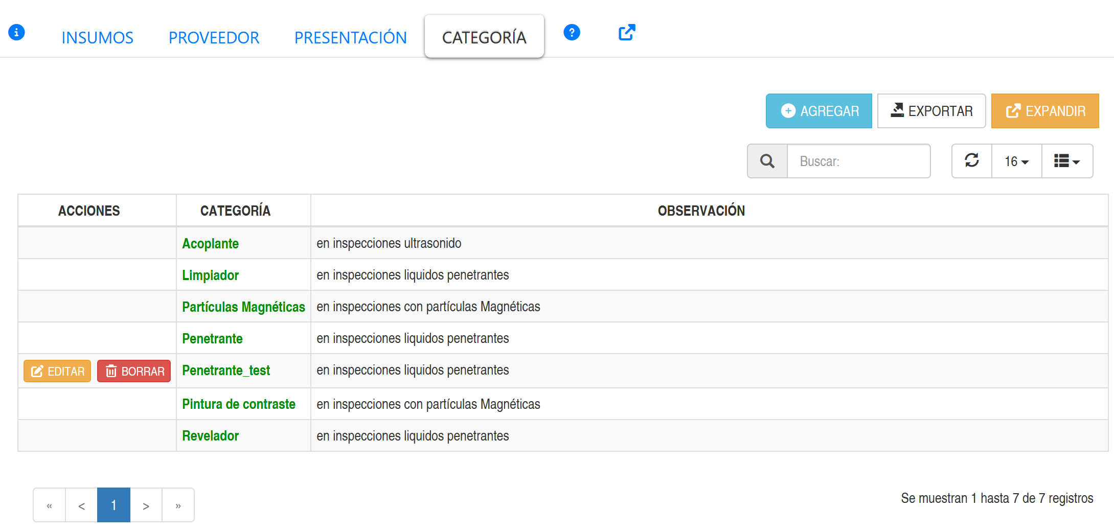 Fig 634 Extracto de pantalla, listado de categorías de insumos