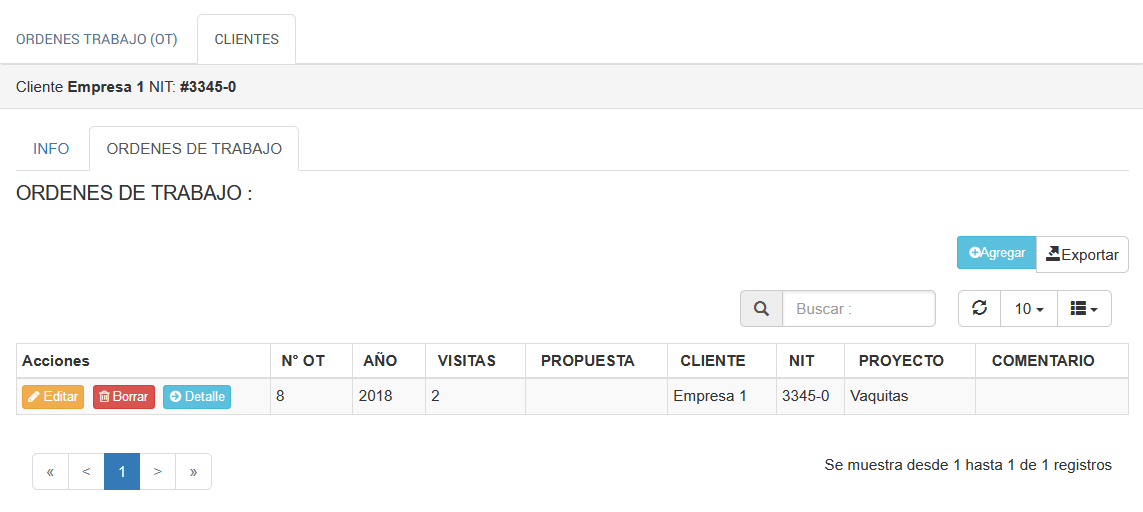 Al seleccionar el botón para un determinado cliente, se puede visualizar el cliente y sus respectivas Ordenes de Trabajo.