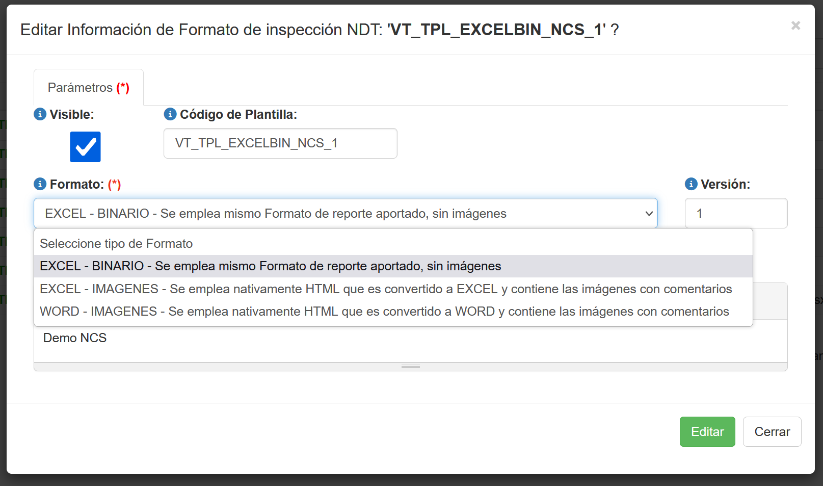 Al presionar el botón Editar aparece una ventana emergente con el siguiente contenido