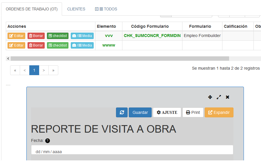 En la imagen anterior es posible apreciar un listado de las inspecciones (reportes) realizados, empleando un elemento gráfico tipo Tabla (ver Tablas de datos) cuyo detalle se muestra a continuación